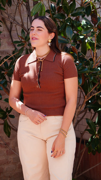 Top punto, tipo polo café. Manga corta. con detalles en manga en negro y blanco.